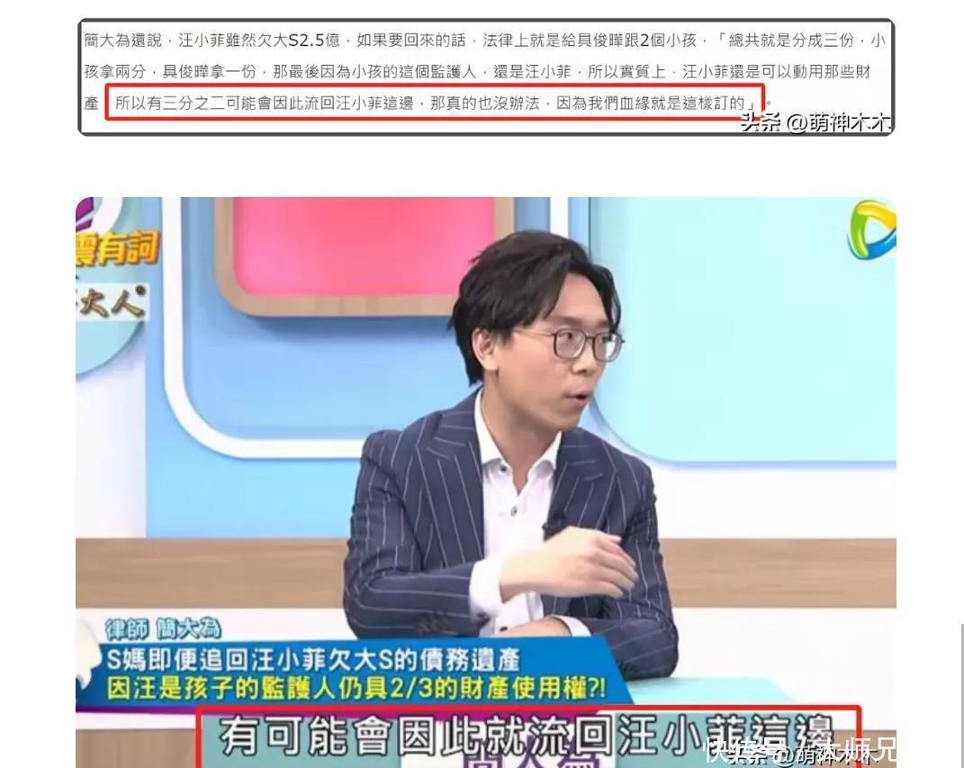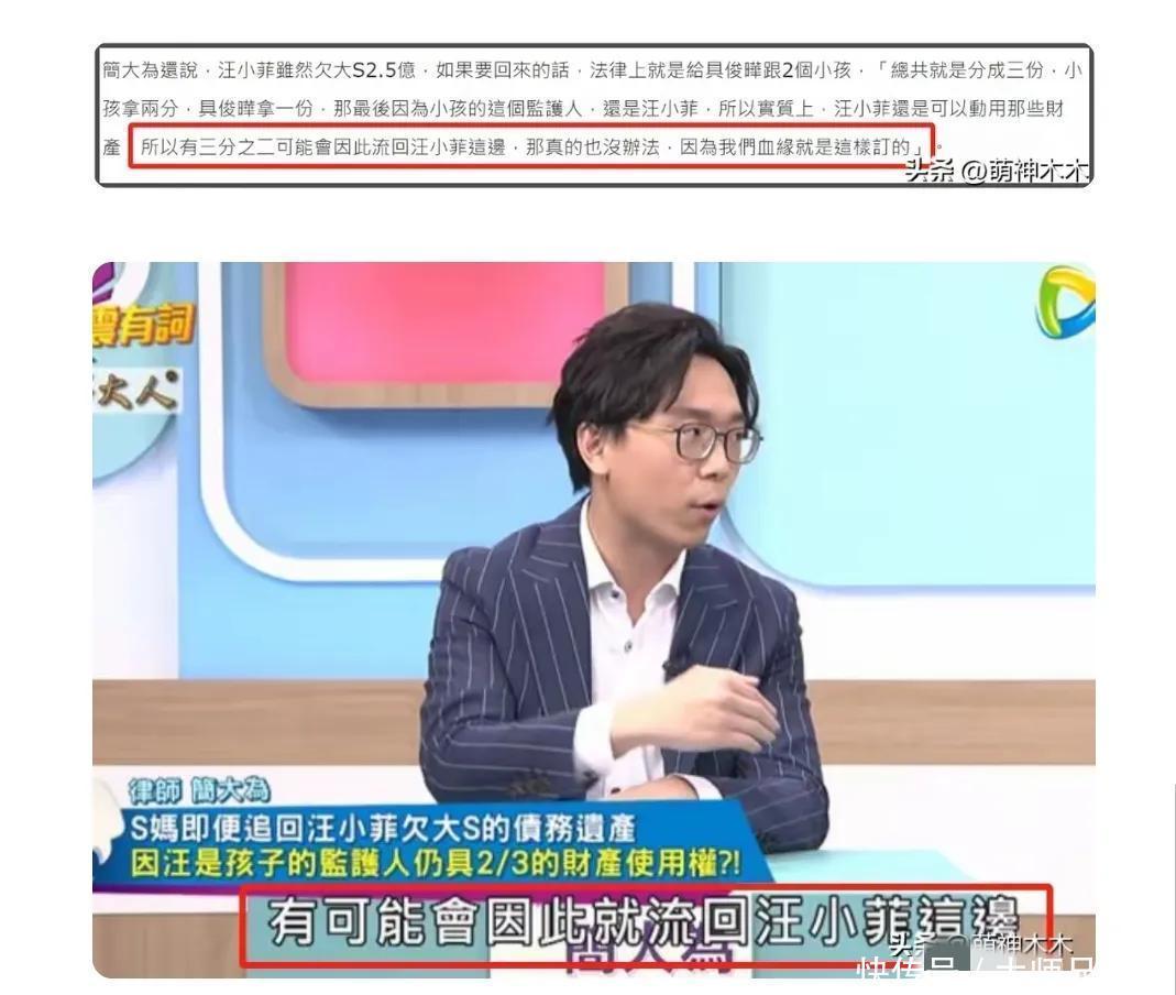 而且据律师讲,就算具俊晔同意授权,汪小菲最后被判付了欠款,那也不会落到S妈的手里,因为这也属于遗产的一部分,还是归两个孩子和具俊晔所有,相当于一大部分又回到汪小菲手里,与S妈没有任何关系。