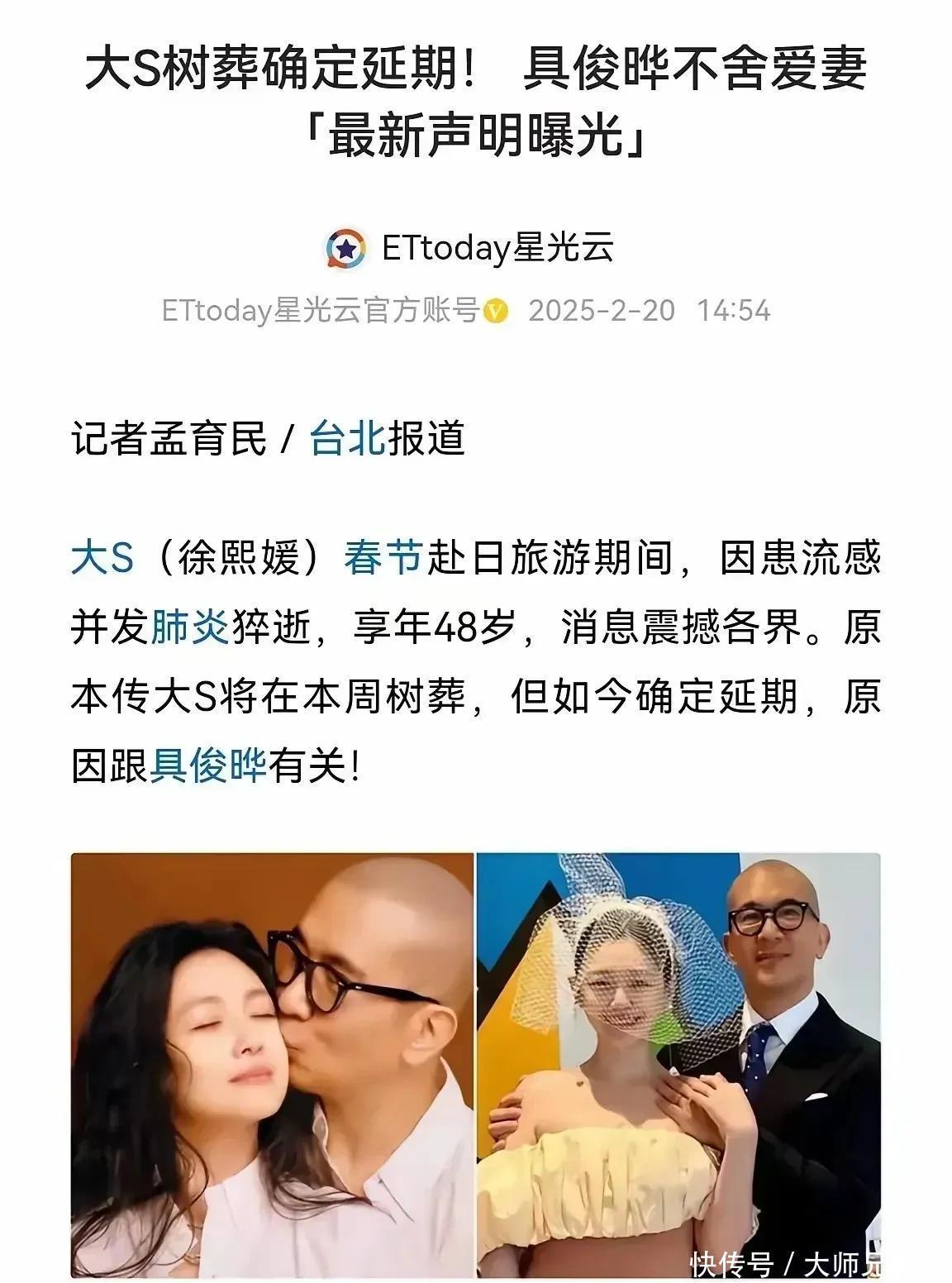 据台媒报道,因为具俊晔不满小S为大S安排树葬,他认为自己将来无法怀念大S,他想以独立固定的空间来安葬大S,也就是说要换个方式安葬大S,为此与S家产生了矛盾。
